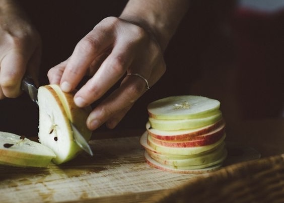 - Corta la manzana fina. Si la rodaja es gruesa, suelta más agua.