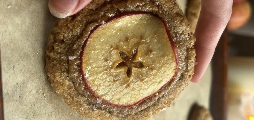 Al añadir una rodaja fina de manzana encima de cada galleta —como se aprecia en la imagen que enviaste— el resultado es rústico, natural y vistoso, pero también práctico. La fruta se carameliza ligeramente en el horno, sin llegar a soltar demasiada humedad, dejando un acabado brillante y una textura tierna que contrasta con la base crujiente.